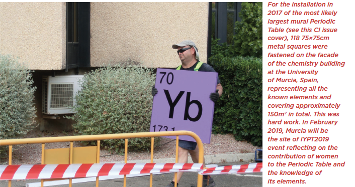 cover: 2019 will be a year a celebrations. For chemists and all scientists alike, the International Year of the Periodic Table commemorating the 150 years of the Periodic Table as first outlined by Mendeleev in 1869 is one celebration not to miss. One Table not to miss is that affixed on the Chemistry building at the University of Murcia and where a IYPT event is set to start February 11, the International Day for Women and Girls in Science. See event details page 51 (or here on iupac.org)